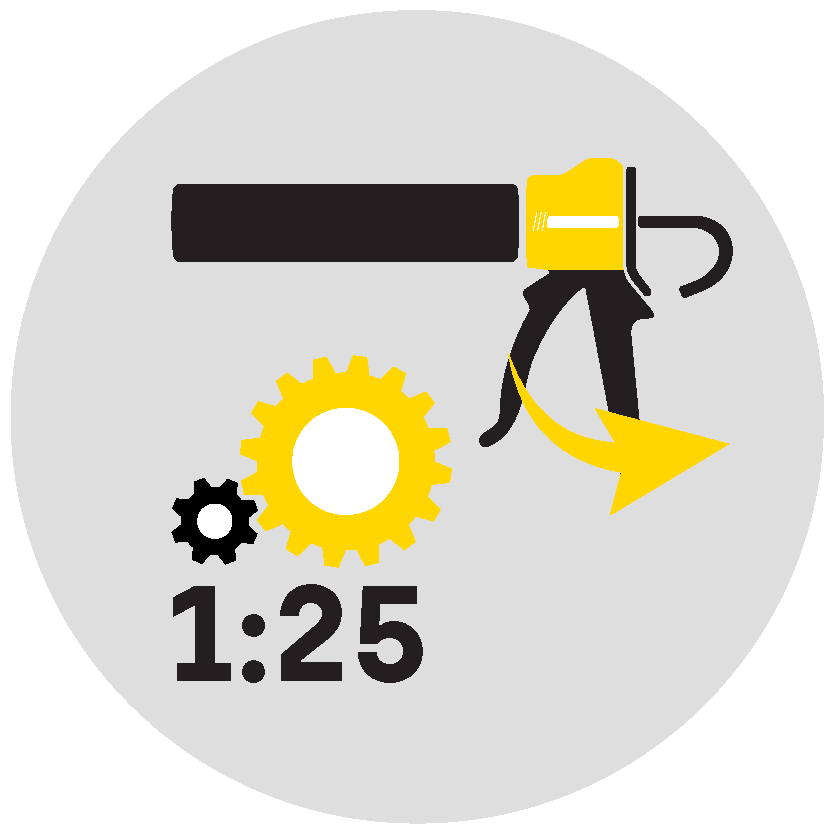 Transmisie de forță ridicată de 1:25 și deci un consum de forță vizibil redus.