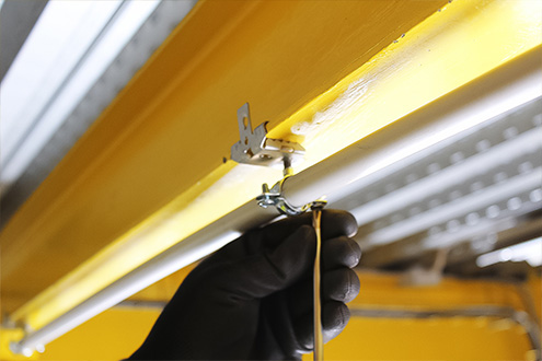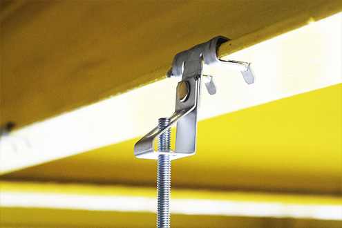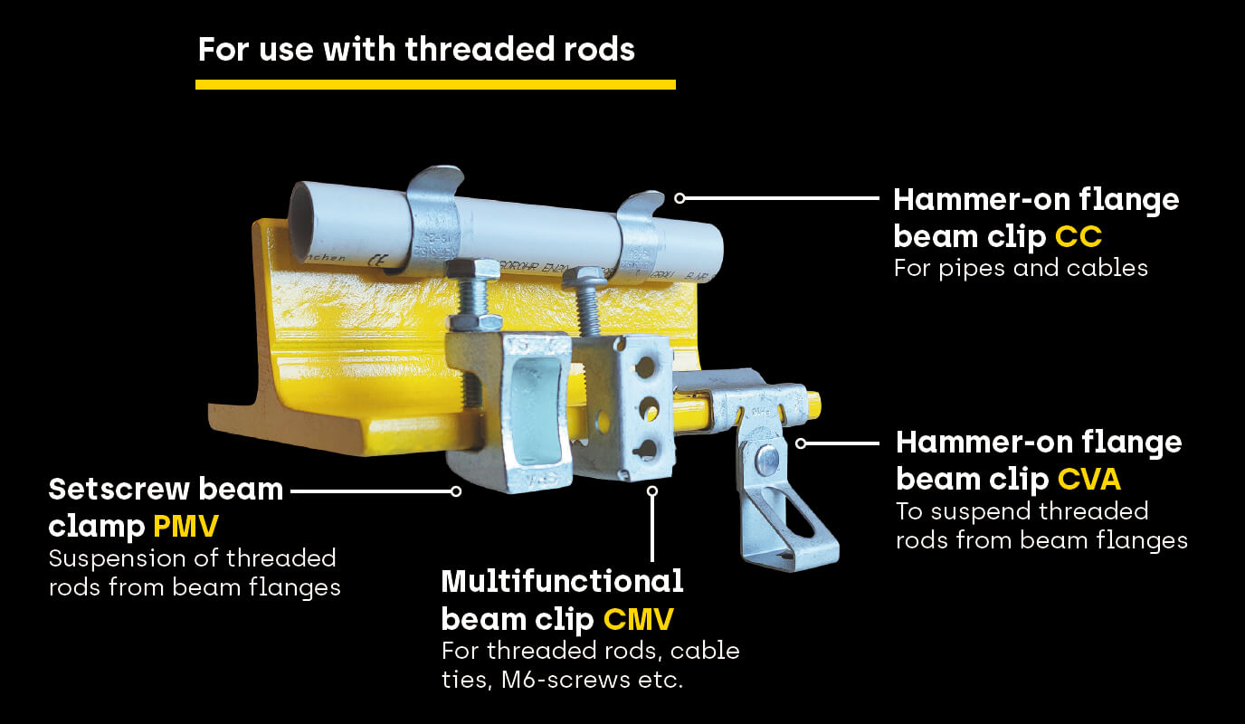 În acest caz se folosesc cleme pentru grinzi. Aceste dispozitive de fixare a grinzilor sau cleme pentru grinzi (cunoscute și sub denumirea de cleme pentru grinzi cu flanșă) pot fi instalate rapid și ușor pe grinzile metalice. În combinație cu tije filetate, coliere de plastic, frânghii și cârlige, gama extinsă de dispozitive de fixare pentru grinzi CELO oferă o soluție de montare rapidă pentru o mare varietate de aplicații în sectoarele electric și HVAC.