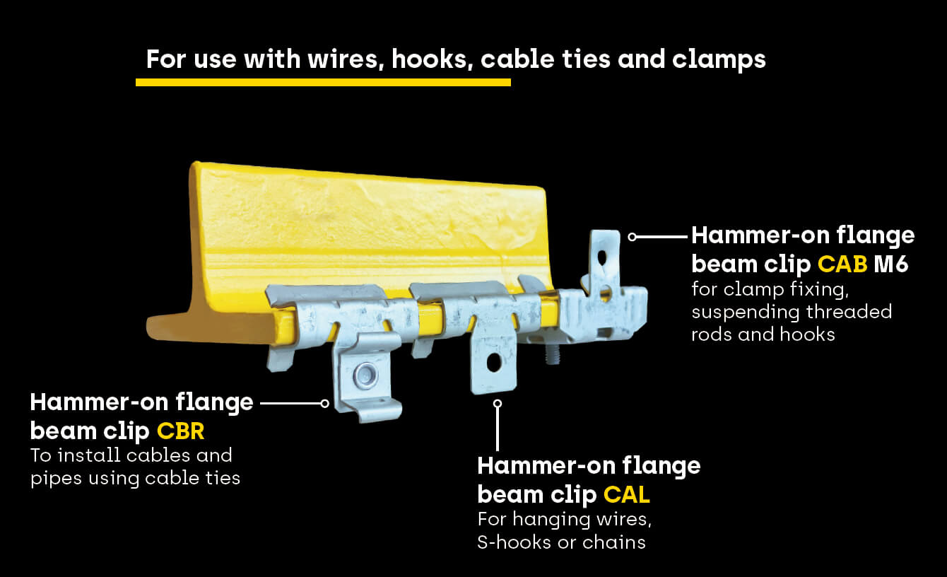 Clema pentru grinzi cu flanșă CAB se fixează pur și simplu cu ciocanul pe flanșă și oferă o soluție stabilă și care economisește timp pentru suspendarea firelor de conectare, a clemelor sau a cârligelor cu ajutorul șurubului M6 premontat.