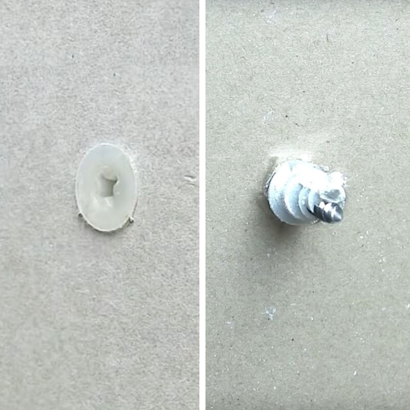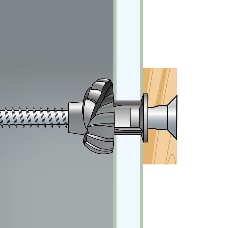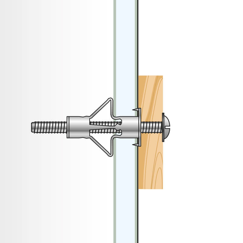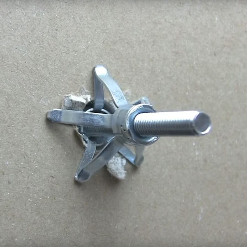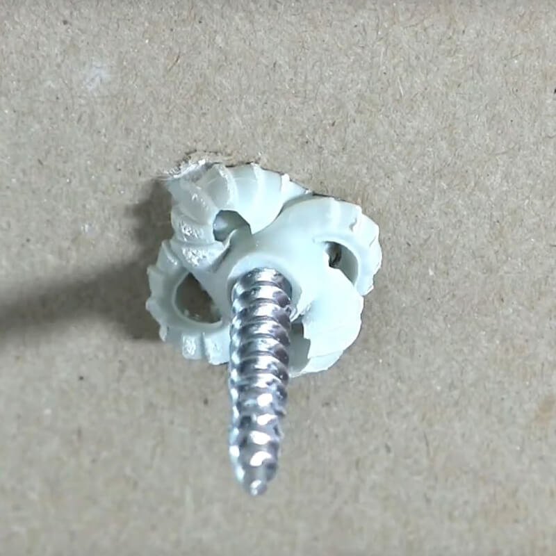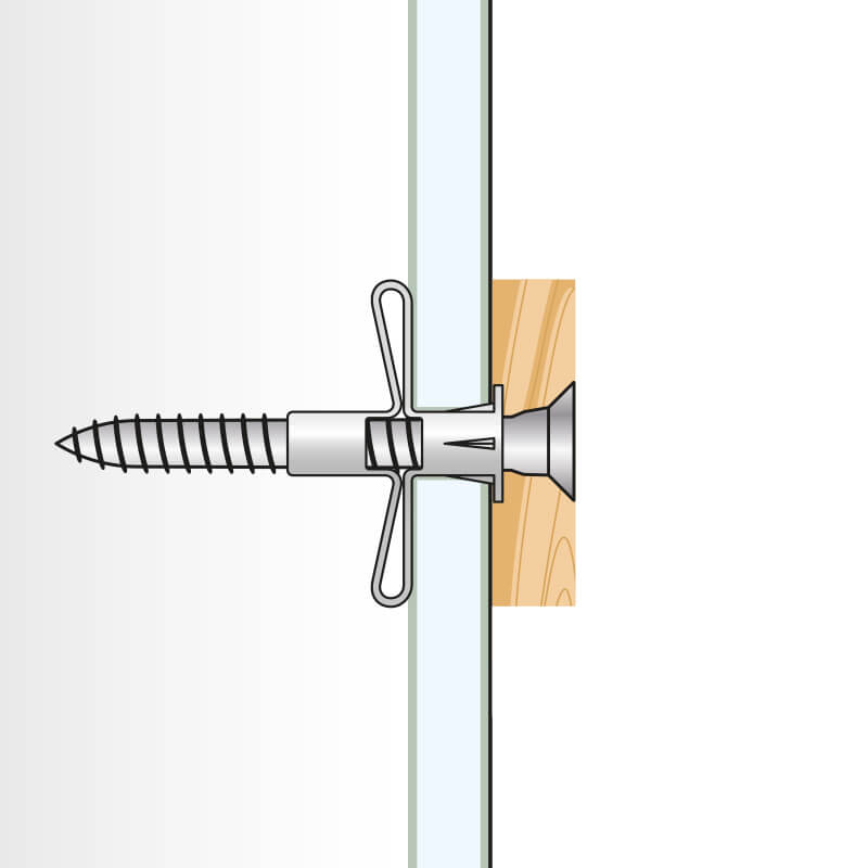 Când înșurubezi șurubul, partea mobilă din spate a diblului se rotește lateral și fixează în siguranță diblul în spatele plăcii.