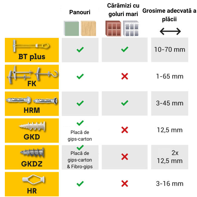 - Ideal pentru fixarea rapidă și sigură a sarcinilor ușoare în pereți din gips-carton